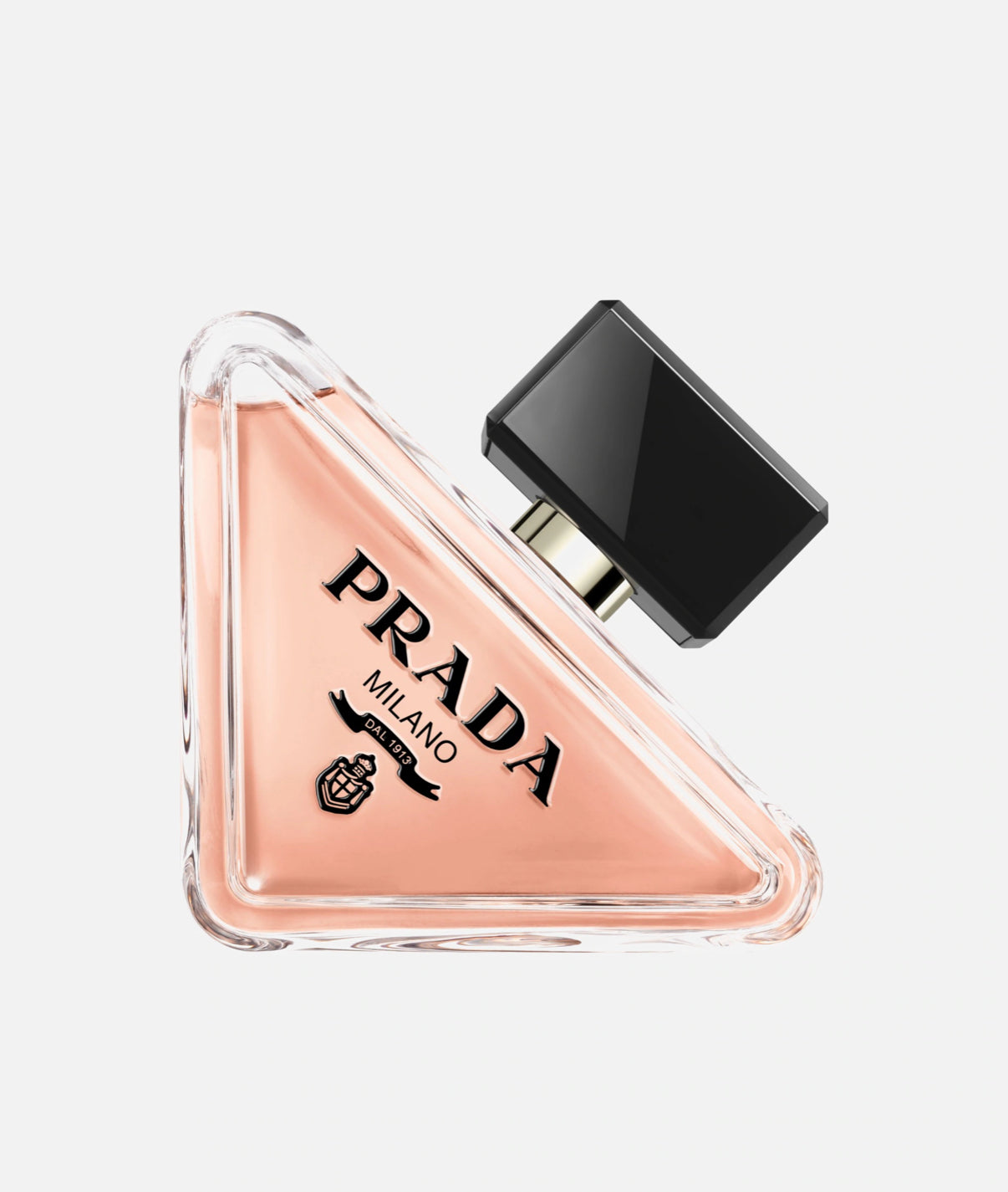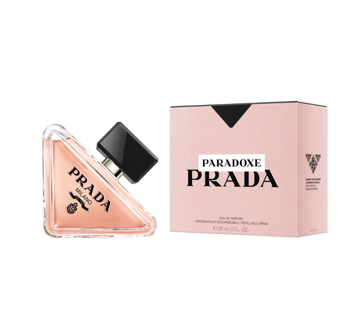 De Paradoxe hervulbare flacon draagt de essentie van Prada in zich, en belichaamt zijn iconische driehoekige logo. De radicale vorm van de flacon wordt verzacht door afgeronde hoeken. Dit terwijl de delicate koraalroze kleur van het parfum contrasteert met de diepzwarte dop en het wapenschild van Prada.